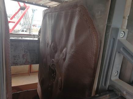 当出水口流速减小,成滴水状流出时,表明滤室内水分含量很少,此时卸载压缩,滤板松开。滤板松开之后,可以看到泥浆压缩之后留在滤室里的泥饼,厚度约40mm。