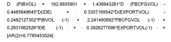 Thus the error correction model D(PIBtvol) = a1 + a2 D(FBCFgtvol) + a3 D(IDEt) + a4D(EXPORTtvol) + a5 PIBt-1vol + a6 FBCFgt-1vol+ a7 IDEt-1vol