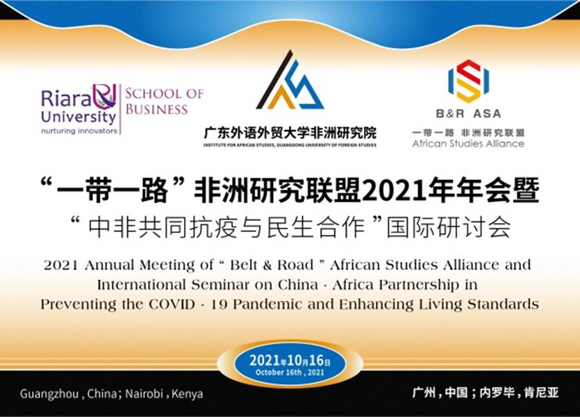 2021年10月16日,由广东外语外贸大学国别和区域高等研究院主办、非洲研究院与肯尼亚瑞拉大学商学院承办的“一带一路”非洲研究联盟2021年年会暨“中非共同抗疫与民生合作”国际研讨会于线上成功召开。