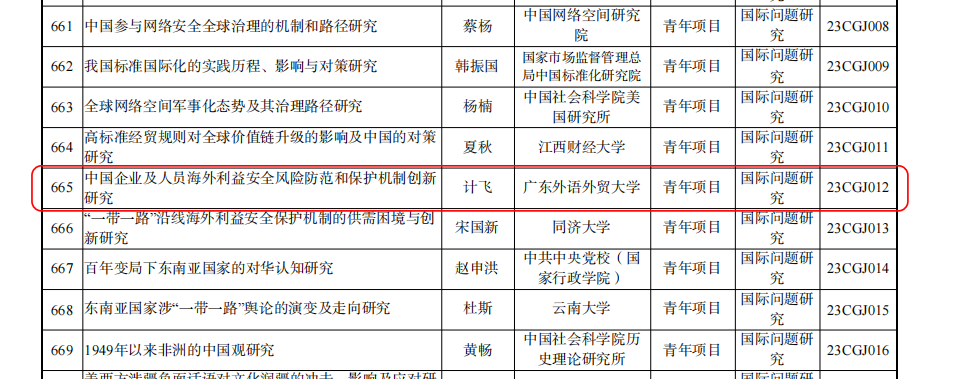 近日,全国哲学社会科学工作办公室正式公布了2023年国家社会科学基金年度项目和青年项目立项结果,我院专职研究员、云山青年学者计飞博士所申报的“中国企业及人员海外利益安全风险防范和保护机制创新研究”项目正式获得国家社科基金青年项目立项。