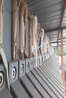 当出水口流速减小,成滴水状流出时,表明滤室内水分含量很少,此时卸载压缩,滤板松开。滤板松开之后,可以看到泥浆压缩之后留在滤室里的泥饼,厚度约40mm。