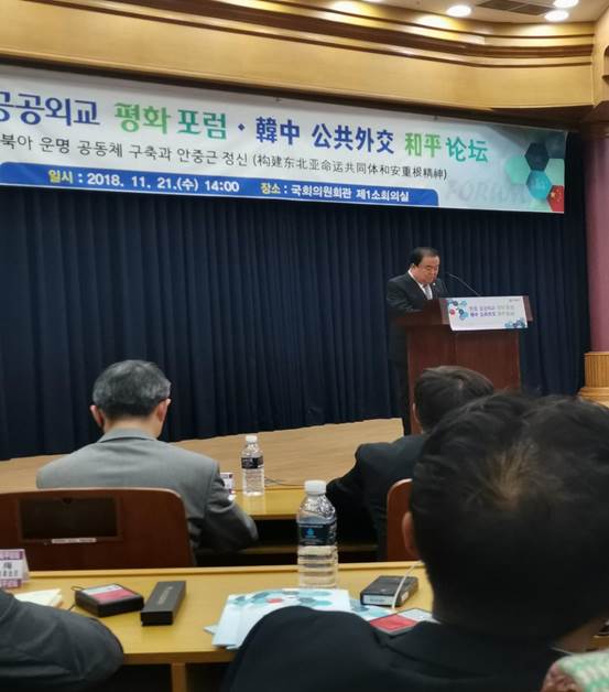 11月21日,以“东北亚命运共同体和安重根精神”为主题的第四届中韩公共外交和平论坛在韩国国会议员会馆召开。包括中国全国政协外事委员会副主任韩方明、韩国国会议长文喜相、议政府市市长安炳龙等中韩两国领导、学者、企业界人士等出席了此次论坛。