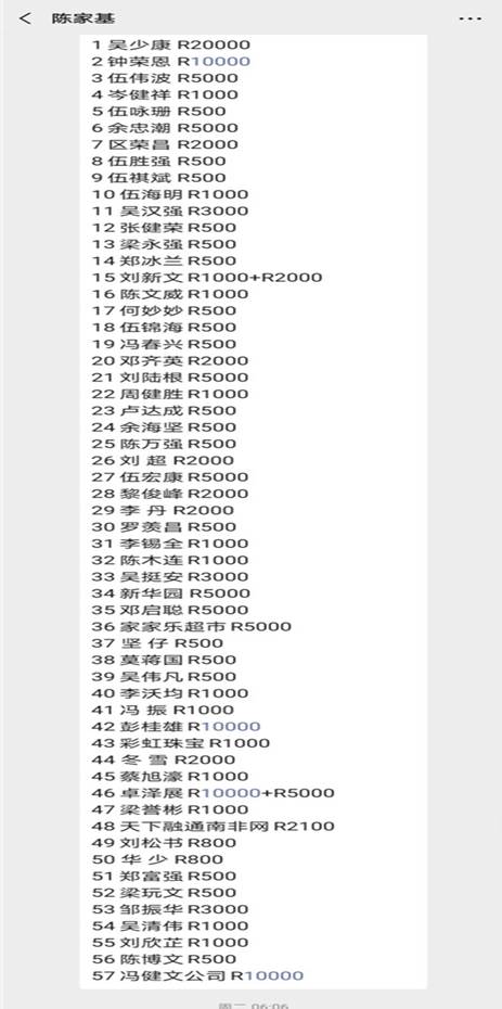 一方有难,八方支援。自疫情发生以来,江门市地区的口罩等医用防护物资告急。得知这一消息后,南非粤港澳总商会为积极响应《江门市红十字会、江门市慈善会关于募集我市疫情防控工作资金和物资的倡议书》的号召,向全体会员呼吁参与爱心捐赠,接受与疫情防控相关的物资,彰显南非华侨华人的家国情怀和社会担当,驰援江门!倡议书发出以后,很快得到南非华人华侨的积极响应,以下是捐款捐资的名单: