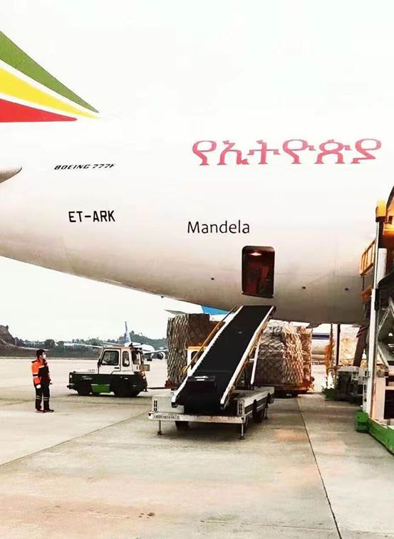 南非华人包机从德班用埃塞俄比亚航空公司播音777运载的50吨570立方米口罩防护衣2月8日到达广州。