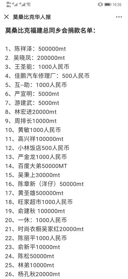 感谢各位侨领、侨胞的热心捐助,截止1月31号晚上18:00点,莫桑比克福建总同乡会在侨领陈祥泽的带领下和各位热心侨胞的共同努力下,共募捐到为抗击“新型冠状病毒肺炎”捐赠款: