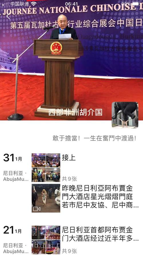 2020年1月30日晚上,尼中友协与尼中商会在胡董事长的企业——尼日利亚阿布贾的金门大酒店宴请了尼日利亚的政府高官和32名联邦议会议员,借此机会介绍中国的抗击新冠病毒肺炎的情况,向他们展示,在中国政府强有力的领导和全国人民的支持下,武汉人民和中国人民一定能够战胜病魔取得胜利。