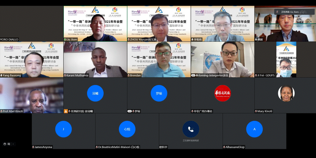 2021年10月16日,由广东外语外贸大学国别和区域高等研究院主办、非洲研究院与肯尼亚瑞拉大学商学院承办的“一带一路”非洲研究联盟2021年年会暨“中非共同抗疫与民生合作”国际研讨会于线上成功召开。