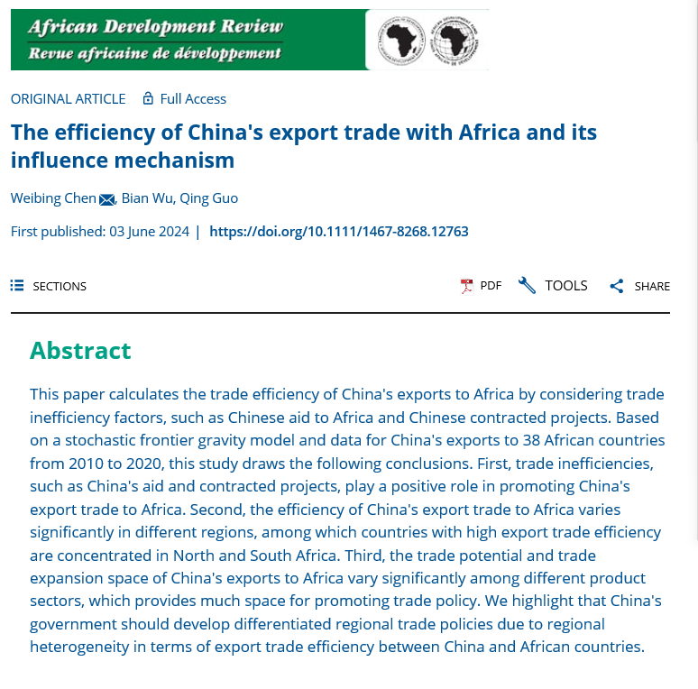 近日,我院陈玮冰博士在SSCI 二区刊物《African Development Review-REVUE AFRICAINE DE DEVELOPPEMENT》(20246月)发表学术论文《The efficiency of China's export trade with Africa and its influence mechanism》。这是我院在非洲经贸领域研究取得的又一重要成果。