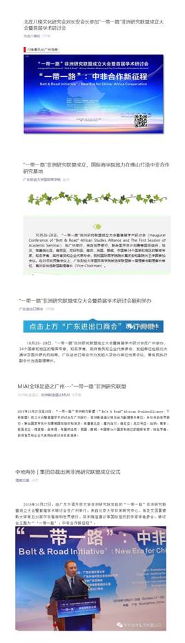 On October 26-28th, "Belt & Road" African Studies Alliance & The First Session of Academic Seminar was held in Guangzhou. It was hosted by Guangdong University of Foreign Studies, organized by Institute for African Studies, Guangdong University of Foreign Studies and Africa Guangdong Business Association, co-organized by Information Office, the Municipal Government of Guangzhou and Guangdong Chamber of Commerce of Importers and Exporters. In response to the implementation of eight initiatives and the establishment of a community of a common destiny proposed in 2018 Beijing summit of the Forum on China-Africa Cooperation, the forum chose "Belt & Road Initiative: New Era for China-Africa Cooperation" as its topic. The forum had drawn great attention from Chinese media and been reported by many well-known press, such as People's network, Xinhua net, Guangdong News, Information News, Nanfang Metropolis Daily, CRI Online, etc.