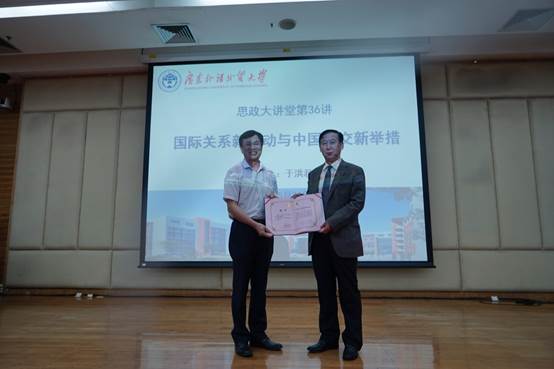 Before the lecture, Mr. He Chuantian issued a letter of appointment for visiting professor of GDUFS for Mr. Yu Hongjun.