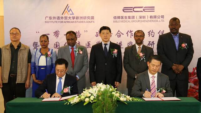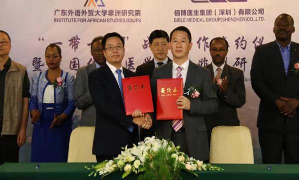 Dans l'après-midi du 10 novembre, au sanatorium de Panyu, l’Institut de recherche sur l’Afrique de GDUFS et le Groupe de médecins Baibo (Shenzhen) Co., Ltd. ont signé un accord de coopération stratégique médical «la Ceinture et la Route». 150 invités chinois et étrangers one participé à la cérémonie de signature, tels que M. Teferi Melesse, Consul général d'Éthiopie à Guangzhou, M. Adam Yousif, Consul général de la République du Soudan à Guangzhou, M. Samb, conseiller culturel et commercial du Sénégal à Guangzhou, Mme Rougui Mbaye, conseillère adjointe, M. Fu Lang, doyen de l’IRA, M. Liu Jisen, doyen exécutif, M. Liang Lijun, directeur du Centre de recherche sur le commerce et les investissements africains, Liu Zhongyi, président du Groupe de médecins Baibo et M. Li Jun, président exécutif de la chambre de commerce du Shaanxi. La cérémonie de signature a été présidée par Chen Shan, partenaire du Groupe de médecins Baibo Co., Ltd..